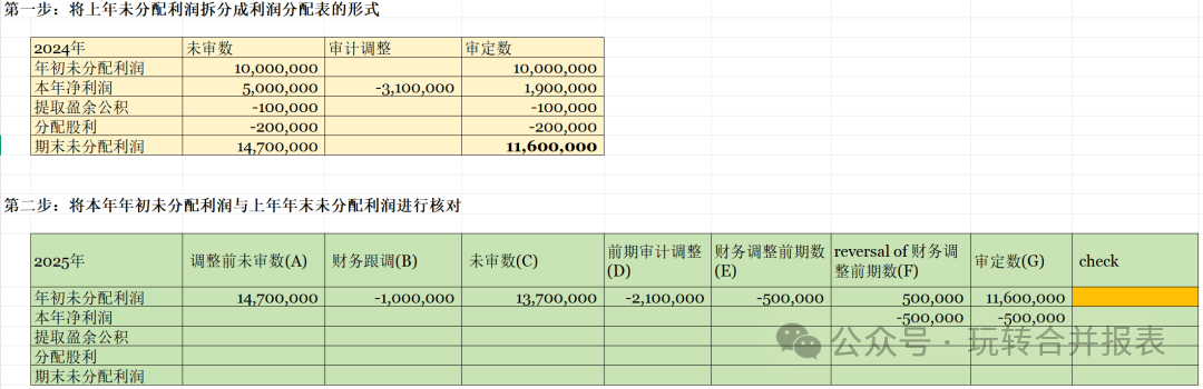 核对年初未分配利润是预审的一项重要的工作,前段时间有同学问,有没有核对年初未分配利润的模板?一方面试算平衡表中年初未分配利润与本年利润都放在了未分配利润不方便核对;另一方面中期的时候,财务与审计都稀里糊涂也做了前期差错更正,各种问题搅在一起,tie年初未分配利润倒是成了一件困难的事。 这篇文章用一个简易模板介绍如何核对年初未分配利润,为方便理解需要模板的同学可私信获取。 一、核对年初未分配利润,并非是一件简单的事 实务中由于前期账务处理不合理,财务对前期差错更正或仅跟调部分审计Adj事项,往往导致年初未分配利润出现不平的情形,这个时候需要耗费大量的时间在tie数上面。 特别是那些把本期利润、本年调整及年初未分配利润一起放在Retained earning中的模板,对初学者非常不友好,遇到这样的情形建议做一个未分配利润的变动表,拆分Retained earning b/f 及Retained earning c/f,这样看起来就比较清晰了。 在学习之前需要弄清楚年初未分配利润与年末未分配利润是如何变动的,完整的未分配利润完整变动过程如下: 年初:年初未分配利润 加: 本年归属母公司净利润 减: 提取法定盈余公积 提取一般风险准备 提取职工奖励及福利基金 提取储备基金 提取企业发展基金 利润归还投资 减: 应付优先股股利 提取任意盈余公积 应付普通股股利 转作股本的普通股股利 应付永续债利息 应付现金股利或利润 分公司上交利润 转增持本 其他减少 加:盈余公积弥补亏损 设定受益计划变动额结转留存收益 其他综合收益结转留存收益 其他调整因素 等于:年末未分配利润 一般情况下,未分配利润变动表不会这么复杂,大多数情况下只有红色字体部分。 二、个别报表年初未分配利润出现差异的原因及应对策略 个别报表年初未分配利润出现差异的原因一般分为以下五类: (1)过入前期调整时,未将上期损益类科目替换成年初未分配利润 应对策略:重新检查上期调整,确保上期损益类科目已替换成年初未分配利润。这个就需要大家明白哪些是损益科目,哪些不是。 (2)过入前期调整时,出现遗漏。 应对策略:重新检查上期调整,不要出现遗漏,确保上期分录均已过入本期,损益类科目已替换成年初未分配利润。 (3)过入前期调整时,会计已跟调上期部分审计调整,审计按去年的调整分录全部过入,导致重复调整。 应对策略:询问财务是否跟调前期审计分录,如有跟调请列明,以保证不会重复过如前期调整。 (4)财务进行差错更正,调整了期初数。 应对策略:询问财务是否进行前期差错更正,如有则将该分录冲回,计入当期损益而不是调留存收益。 (5)对前期进行追溯调整形成的差异。 无需应对,正常披露。(如:成本法转权益法,按权益法追溯单体剩余部分需要调整年初未分配利润) 三、合并报表年初未分配利润出现差异的原因及应对策略 (一)合并报表的核对是建立在个别报表的基础上的,合并报表年初未分配利润出现差异的原因主要有以下三类: (1)个别报表不平导致。 应对策略:检查个别报表年初未分配利润是否等于上期末,确认每家单体公司均已按要求调整完毕。 (2)上期合并中的损益,未按要求过入本期。 应对策略:检查上期合并抵销分录,确认均已过入本期,不存在漏分录及重复调整的情形,所有损益类科目已替换成年初未分配利润。 (3)对前期进行追溯调整。 无需应对,差异属于正常情况,正常披露。(如:同一控制下企业合并) (二)合并报表年初未分配利润不平的情况下如何处理? 将单体过入合并后,年初未分配利润不平是常态,通常情况下需要做以下检查。 (1)检查单体的年初未分配利润是否已全部编平,这个可以通过设置公式的形式进行检查,快速找出哪些公司有问题。 (2)检查单体后,发现单体年初未分配利润不平的情形,分析是否合理,若合理则保留差异,不合理则需要重新核对个别报表的年初未分配利润。 (3)单体核对无误后,将合并上期调整分录过入本期合并,同时涉及损益的全部替换成为年初未分配利润。(注意所有者权益的抵销分为成本法及权益法,权益法通常不是简单粗暴的往下抄) (4)合并年初未分配利润的核对与单体不同,通常需要考验合并报表编制的功底。成本法与权益法的相互转化都需要学会,否则换个套路就麻了! 四、案例 (一)第一步将上年度(2024年)未分配利润拆分成利润分配表的形式 为了方便理解,本文介绍常规情况: 年初未分配利润 +本年净利润 -提取盈余公积 -分配股利 =期末未分配利润(未分配利润) 案例:某公司2024年审计做了三笔调整,调整损益为-310万,分别为 2024年审计调整如下: (1)事项一 借:管理费用 1,000,000 贷:累计折旧 1,000,000 (2)事项二 借:销售费用 2,000,000 贷:预计负债 2,000,000 (3)事项三 借:财务费用 100,000 贷:其他应付款 100,000 2024年费用调增了310万,净利润调减310万!拆成未分配利润变动表的形式如下: