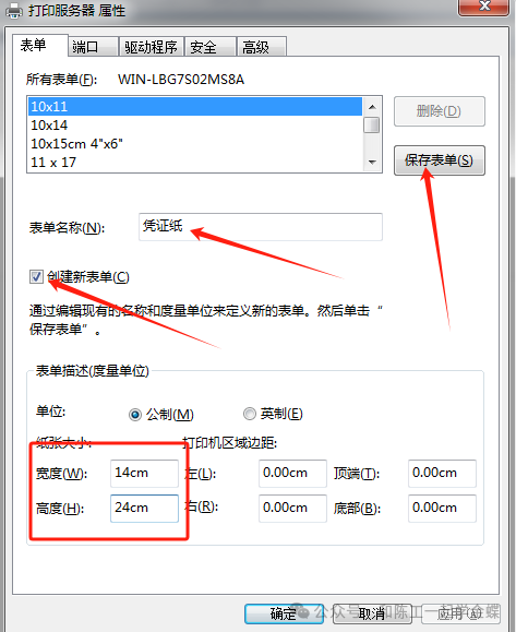 选中要打印的打印机,点上面的打印服务器属性 勾上创建新表单,上面表单名称填上凭证纸,左下角宽度填14,高度填24 特别注意:凭证纸是竖着放进去的,和A4一个方向,所以宽是14高是24,点右上角的保存表单