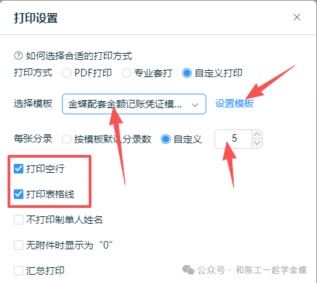 系统默认凭证打印行数5行,专业套打和自定义打印,可增加或减少打印行数;PDF打印不支持设置打印行数
