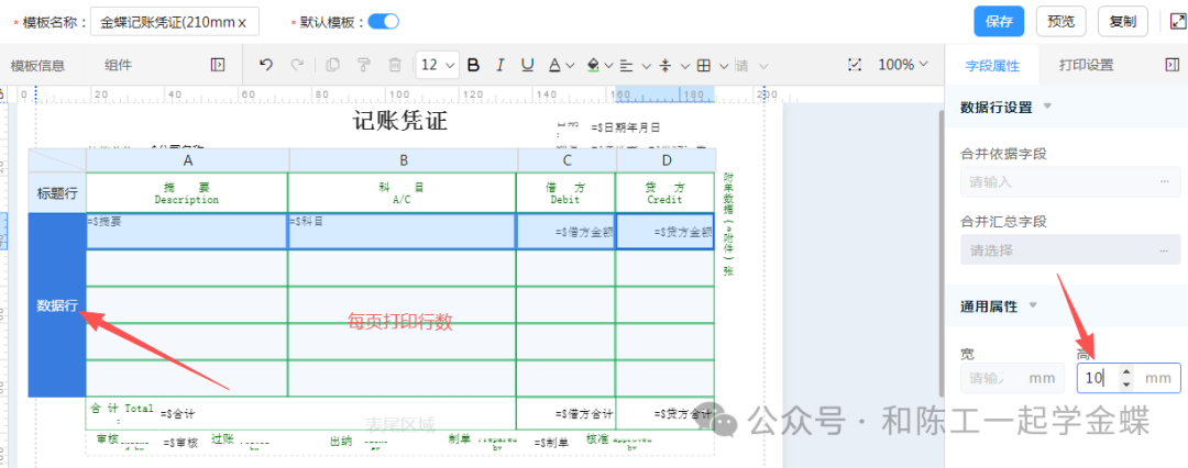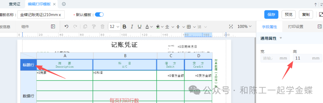 自定义打印可自行设计和编辑打印模板,简单灵活,可以自己设置行高,和每列的宽度首先要在打印机上设置纸张大小,然后按如图设置,然后点设置模块再选中数据行,右边设置数据行就是具体的凭证的分录行的高度然后可以再设置每行的宽度,可以直接拖动,如图所标,摘要,科目,金额的宽度右边打印设置,可以设置纸和方向,宽度和高度,和打印机里面的纸张一样,然后上下左右边距进行调整