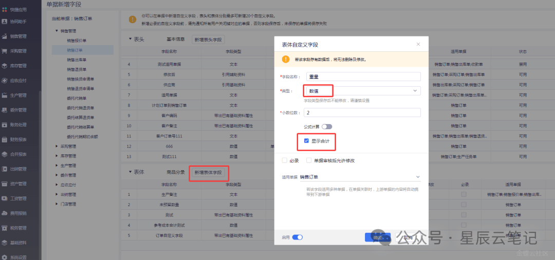 8、为什么单据新增自定义【数值】字段设置了“单据审核后允许修改”,但是点进去无法修改? 【问题描述】 销售订单设置自定义【合计】字段,勾选了“单据审核后允许修改”,但是审核后的销售订单该字段显示为灰色,无法点击修改