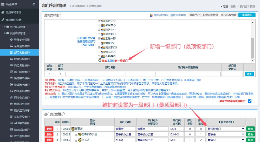 新增时和后续维护时,都可以设置此部门为一级部门(最顶级部门)。