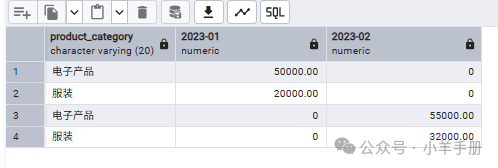 -- 使用COALESCE或ISNULL处理NULL值SELECT  sales_month, COALESCE(MAX(CASE WHEN product_category = '电子产品' THEN sales_amount END), 0AS "电子产品", COALESCE(MAX(CASE WHEN product_category = '服装' THEN sales_amount END), 0AS "服装"FROM sales_dataGROUP BY sales_month;