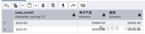 -- 使用聚合函数和GROUP BYSELECT  sales_month, MAX(CASE WHEN product_category = '电子产品' THEN sales_amount ENDAS "电子产品", MAX(CASE WHEN product_category = '服装' THEN sales_amount ENDAS "服装"FROM sales_dataGROUP BY sales_month;