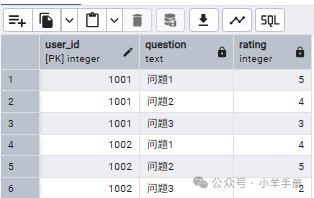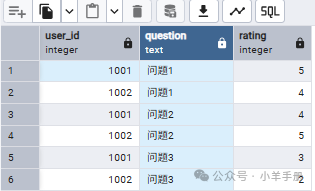 -- 将问卷的宽表转换为长表SELECT     user_id,    '问题1' AS question,    score1 AS ratingFROM user_surveysUNION ALLSELECT     user_id,    '问题2' AS question,    score2 AS ratingFROM user_surveysUNION ALLSELECT     user_id,    '问题3' AS question,    score3 AS ratingFROM user_surveys;