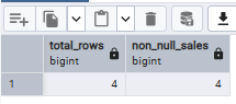 -- 检查是否有NULL值SELECT  COUNT(*as total_rows, COUNT(sales_amount) as non_null_salesFROM sales_data;