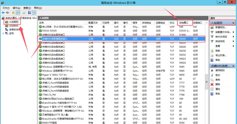 打开Windows系统防火墙,点击入站规则,然后点击列标题“本地端口”,用本地端口来排序,应该是可以找到58000这个端口,找得到就不用新建入站规则了;如果找不到,那么就需要手工增加一条针对端口58000的入站规则。