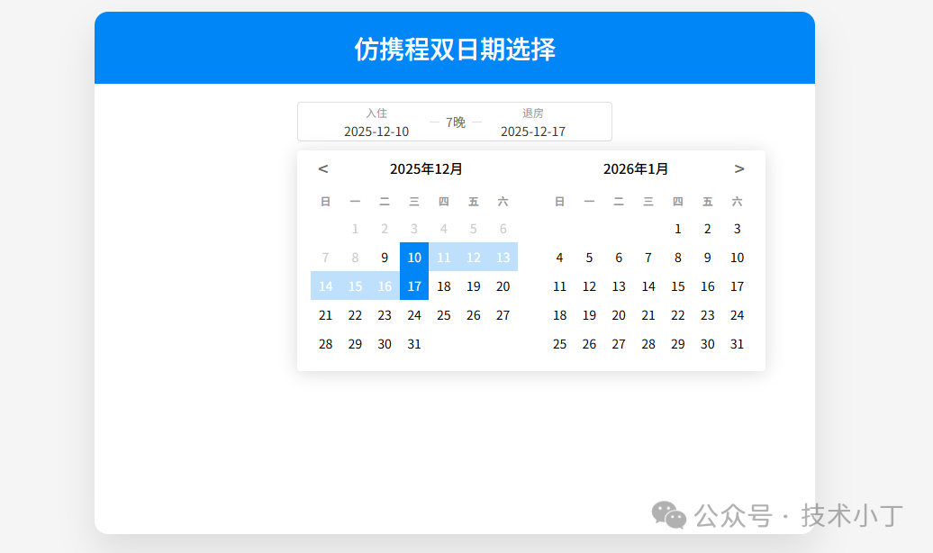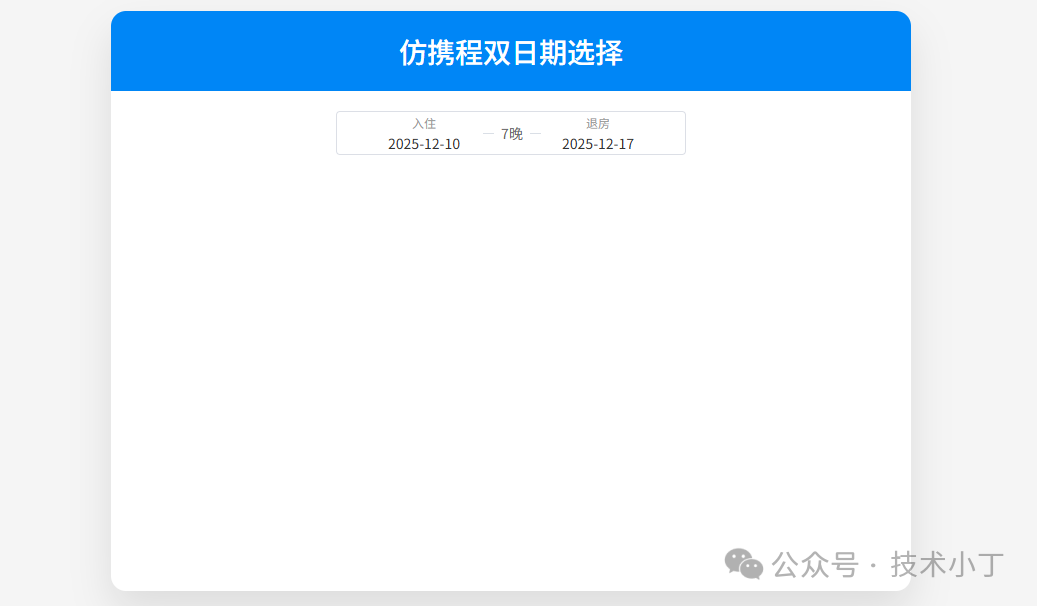 在旅游预订网站中,日期选择器是一个核心组件,特别是像携程这样的平台使用的双日期选择器,能够让用户直观地选择入住和退房日期。本文将详细介绍如何使用 HTML、CSS 和 JavaScript 实现一个仿携程的双日期选择器。效果演示