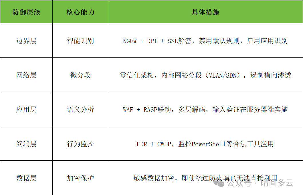 • 部署"防火墙后的防火墙",建立多层防御体系,不依赖单一设备