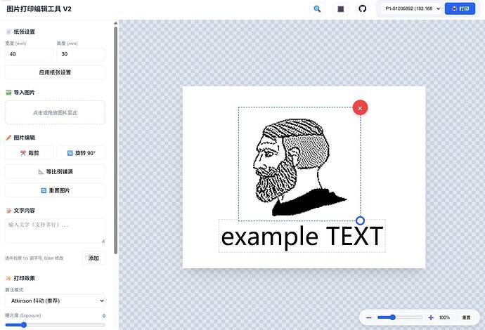 一个适合各类标签打印机的所见即所得(WYSIWYG)网页图片编辑器,专注提升小尺寸黑白贴纸的打印效果。应用简介web-printer是一个为标签打印场景设计的网页图片编辑器。起因是德佟P1标签打印机官方PC网页端打印效果较...