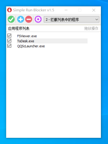 SimpleRunBlocker是一款免费无广告的,可以阻止特定的应用程序在电脑上运行的绿色软件,它大小仅有418KB,目前仅支持Windows平台。附件:RunBlock.zip解压软件压缩包后,双击运行其中的RunBlock.exe就可以打开软件:点击【+】按钮,可以给它添加电脑上的应用程序(选择应用程序的主程序...