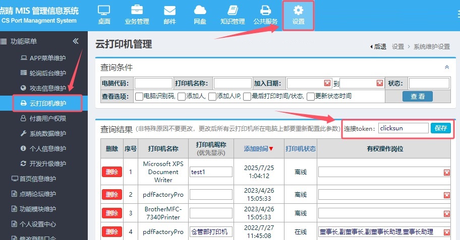 点晴MIS云打印服务后台程序。如何获取连接token?以管理员身份登录点晴MIS系统,进入设置-》系统维护设置-》系统维护管理-》云打印机维护:在上面就会看到并更改此连接码了。