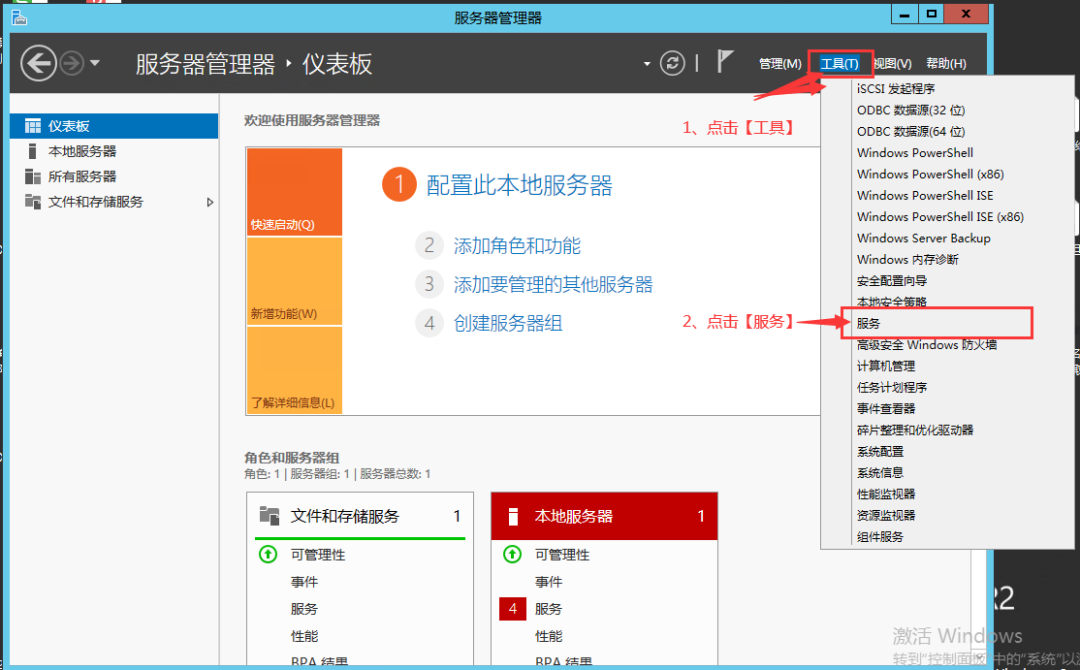 首先要把 SQL Server 的服务都关掉,通过 Windows Server最下面搜索框搜索 【服务器管理器】 并打开,点击【工具】——>【服务】(或者同时按住 Win + R 键,在弹出的运行框里面输入【services.msc】命令也可以进入到【服务】)