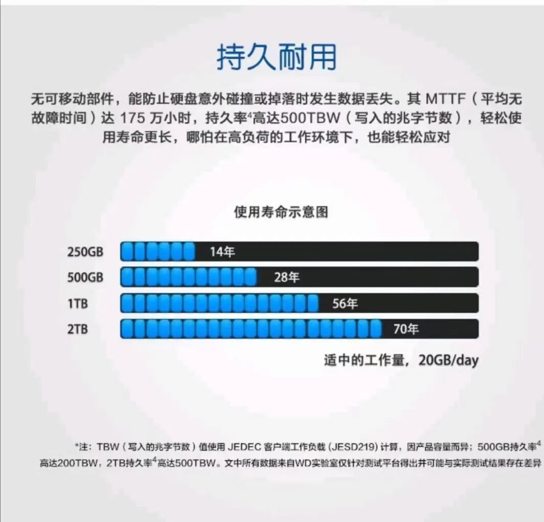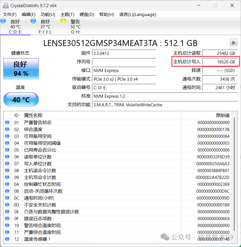 五、查看固态硬盘的写入量TBW: 使用CrystalDiskInfo等软件可以查看固态硬盘的已写入量,比如我2019年的笔记本固态硬盘到现在6年的写入量是18TB,按最低100T的总写入量有20%,总共可用30年。但实际上的使用寿命与存储芯片本身质量有关: