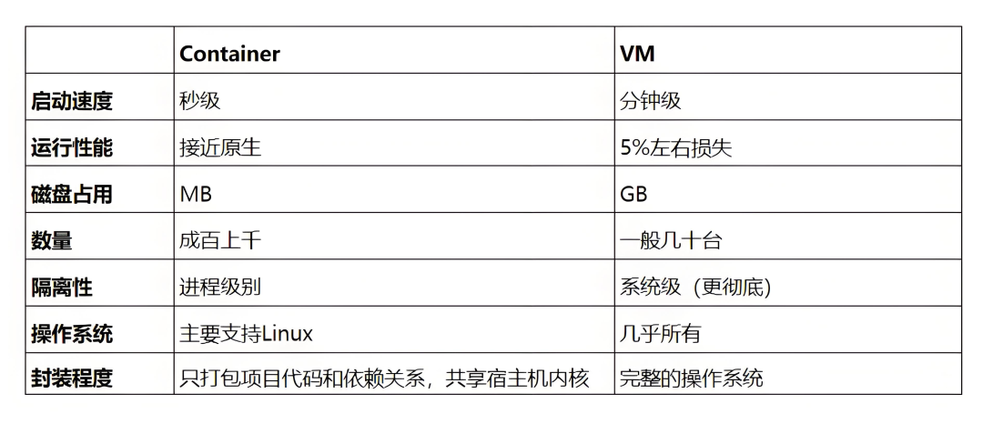 → 容器资源占用仅为 MB 级,虚拟机需 GB 级,单机容器部署密度可达虚拟机的 10 倍以上。 - 容器直接调用宿主机内核,I/O 与 CPU 性能接近原生应用(损耗 <2%);