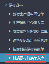 4.提交后,返回到左侧的功能菜单,找到并点击“材损原材转换单入库”