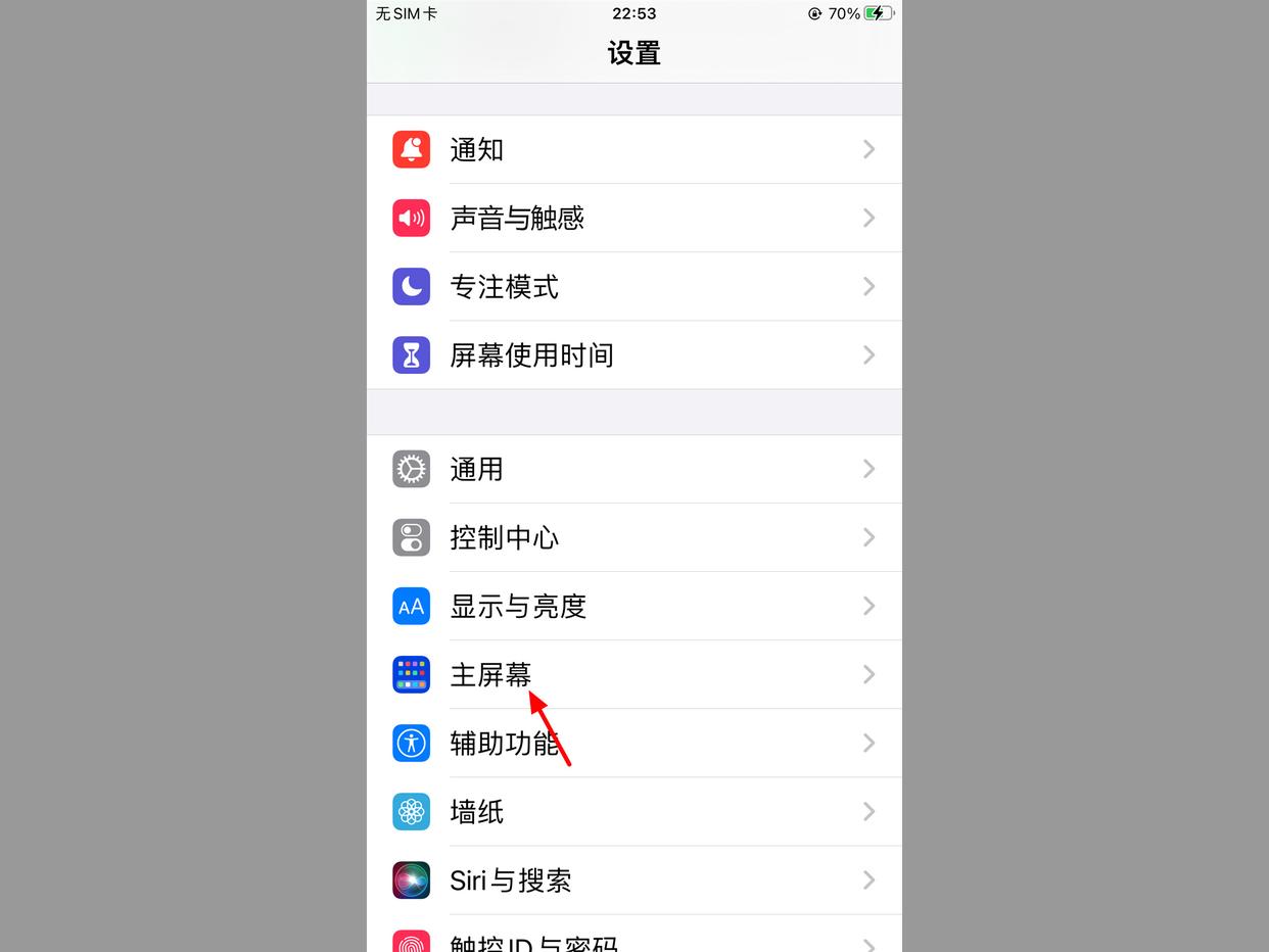 2、在设置界面,向下滑动,找到并打开【主屏幕】。