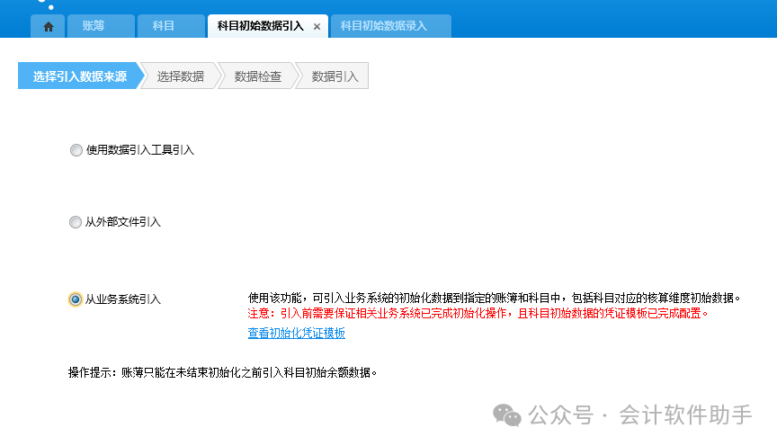 (2)科目初始数据引入:财务会计→总账→初始化→科目初始数据引入;a:先点击科目初始数据录入界面,点击引出按钮下的引出模版;(有核算维度的初始数据需要在科目的核算维度录入界面手工录入或者进行批量填充引入)b、打开财务会计→总账→初始化→科目初始数据引入页签,选择从外部文件引入,点下下一步选择相应的文件,引入即可;(3)科目初始数据引入-从业务系统引入:点击科目初始数据引入,选择从业务系统引入,然后选择相应的业务系统名称,最后引入;(1)财务会计→总账→初始化→总账初始化;点开总账初始化,选择相应的账簿,点击结束初始化;