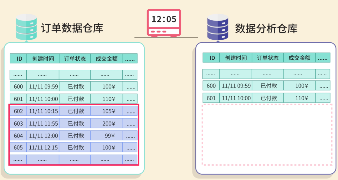 全量同步什么是数据同步呢?就像你有两个手机,要把其中一个手机的照片复制到另一个手机里。数据同步就是把一个数据库的数据,定期复制到另一个数据库里。 你心想:这还不简单吗?我写个定时任务,每天 把整个订单表的数据 全部查出来,然后 一股脑插入 到数据仓库! ![]() 这种方法叫 全量同步,不管数据有没有变化,每次都把所有数据重新复制一遍,简单粗暴。 第一天,公司有 1 万条订单数据。你的程序跑了 3 个小时,同步成功! 老板看着数据夸到:不错啊小阿巴,开发神速啊! ![]() 你内心暗爽:高端的功能往往只需要最简单的代码。 ![]() 基础告警第二天一早,你还没到公司,就收到了运营小姐姐的夺命连环 call:“小阿巴!出大事了!昨天晚上的数据同步失败了,现在老板还没看到昨天的数据,他正在会议室发火呢!” ![]() 你意识到:现在的程序是不可靠的,如果因为网络等原因同步失败了,可能要到第二天才会发现。 于是你给程序加了一段逻辑:如果同步失败,会记录错误日志,同时发邮件通知管理员,并且把数据库回滚到同步前的状态。 ![]() 这样如果出了问题,你会比老板先发现,手动重新执行一遍同步任务就好。 增量同步过了几天,老板黑着脸找你了:“小阿巴,为什么今天数据还没同步完?” 你看了下订单数据,立刻发现了问题。现在有 10 万条数据,程序跑了 30 个小时还没结束;这样下去,如果有 100 万条数据,估计要 300 个小时! 老板:少废话,快点解决,不然送你到隔壁餐饮部沉淀沉淀。 ![]() 你开始思考:既然全量同步太慢,那我只同步每天新增的订单不就行了? ![]() 这就是 增量同步,约定每天 0 点执行同步任务,只同步昨天 0 点之后创建的订单。 ![]() 这样大大减少了每次同步的数据量,任务的执行时间不再线性增加了。 但很快,你发了一个问题,订单的状态是会发生变化的,比如用户付款后又退款。 如果使用订单创建时间作为增量同步的分界标志,只能同步新增的订单,但是订单状态的更新不会同步! ![]() 于是,聪明的你使用 updated_time 字段进行增量同步,这个字段会在每次数据变化时自动更新。 ![]() 这样新增和修改的数据都能同步了! 你内心窃喜:聪明如我小阿巴,老板夸我好开发。 ![]() 批处理过了几天,公司搞了一波大促活动,当天订单量比平时多了几倍,老板请大家通宵狂欢开 party。 结果正在你欢唱 “只因你太美” 的时候,突然公司的运维大叫:不好了不好了,我们的项目服务器卡死了,用户无法下单! 你看了看时间,0 点多,不正是数据同步任务的执行时间么?你瞬间汗流浃背,放下麦克风,赶回公司修 Bug。 原来是因为一次查询出来的订单数据太多了,都加载到内存,导致服务器 OOM 内存溢出了。 ![]() 你悔不当初:唉,早该想到这个问题,既然单次处理数据量太大有风险,那我就 分批处理。 每 100 条数据为一批,每次只从数据库中分页查询出这一批数据,同步完这一批,再执行下一批。 ![]() 这样每次只处理少量数据,内存压力小;而且如果某一批处理失败,只需要回滚和重新同步这一批,而不是全部重来。 问题算是解决了,但是今夜你彻夜难眠,你似乎成了公司业务增长后,唯一不开心的那个人。 ![]() 希望今后不会再遇到这种闹心事了吧。 游标机制但生活总是这样,屋漏偏逢连夜雨。两天后,你又收到了老板的咆哮:“狗阿巴,这就是你做的数据同步?你自己看看丢了多少数据!” 你大惊,丢失数据?不应该啊。。。 经过仔细排查,你发现了问题:如果在分页查询的过程中,有新的数据被插入或更新,就会导致数据偏移和丢失! 比如查询第 1 页时,符合条件的订单有 4 条: 执行第 1 页查询,每页 2 条,偏移量为 0: 查询结果返回订单 A(08:00)和订单 B(09:00),同步完成后将偏移量调整为下一页 可就在查询下一页前,订单 B 因为 “修改订单状态” 被更新,这时订单 B 的更新时间就不在查询范围内了。 这就导致查询下一页 ![]() 怎么解决这个问题呢? 这可难不倒你小阿巴,既然 动态数据集 中使用 SQL 自带的 OFFSET 偏移作为分页起点会出问题,那不妨 自定义一个标志来记录下一批要同步的起点。 这就是游标机制。 比如我约定自增的主键 id 作为游标,每查询一批数据之后,把这批数据的最后一条记录作为新的游标值;查询下一批数据时,只查询 id > 游标的数据。 ![]() 这样不仅防止数据丢失,还避免了 OFFSET 深度分页带来的性能问题。 此外,如果把游标想象成进度条的断点,可以更清晰地记录同步进度,失败后可以从断点继续。 做完这一通优化后,你长吁了一口气,工作看来是保住了。 ![]() 性能优化你以为终于可以安稳一段时间了。但没想到,公司的好日子才刚刚开始。 随着老板大力扩张业务,公司每天的订单量可以达到百万条,你的同步任务每次要跑几个小时才能完成。 更要命的是,老板现在对数据的依赖越来越强,要求每隔 2 个小时就要同步一次数据! 怎么能够让任务执行更快呢? 这时,你想起了曾经在 程序员面试神器 - 面试鸭 上背过的各种性能优化八股文。好家伙,终于能派上用场了! ![]() 首先,修改插入数据库的操作方式。之前是一条一条地插入订单数据,改为执行一条批处理语句来同时插入同一批内多个订单数据,减少了跟数据库通信的次数,性能大幅提升。 ![]() 但是你觉得还不够快,于是优化了批处理的流程。之前是等一批同步完再同步下一批,串行执行;现在你启动了多个线程,每个线程负