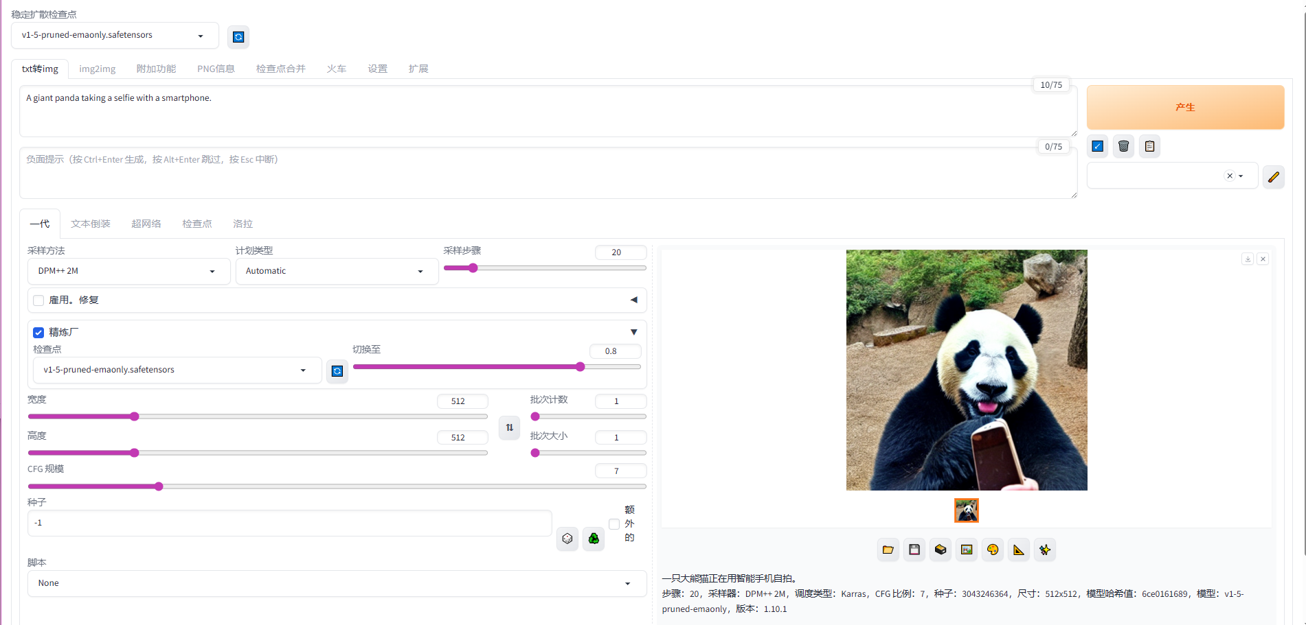 注意如果有报错,需要设置一下: modules.devices.NansException: A tensor with NaNs was produced in Unet. This could be either because there's not enough precision to represent the picture, or because your video card does not support half type. Try setting the "Upcast cross attention layer to float32" option in Settings > Stable Diffusion or using the --no-half commandline argument to fix this. Use --disable-nan-check commandline argument to disable this check.