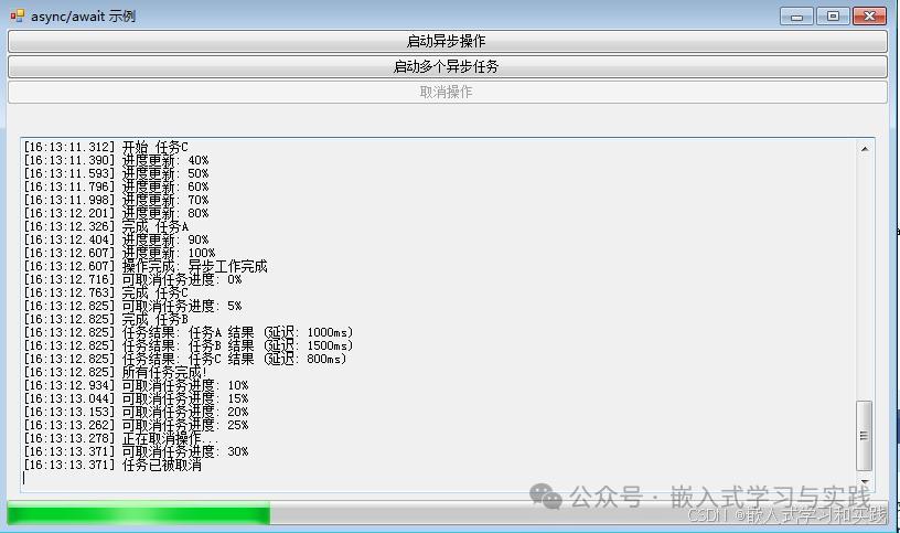 private async void btnStartAsync_Click(object sender, EventArgs e) { LogMessage("开始异步操作..."); btnStartAsync.Enabled = false; try { var progress = new Progress<int>(percent => { progressBar.Value = percent; LogMessage($"进度更新: {percent}%"); }); string result = await DoAsyncWork(progress); LogMessage($"操作完成: {result}"); await StartCancellableWork(); } catch (OperationCanceledException) { LogMessage("操作被取消"); } catch (Exception ex) { LogMessage($"操作出错: {ex.Message}"); } finally { btnStartAsync.Enabled = true; } }