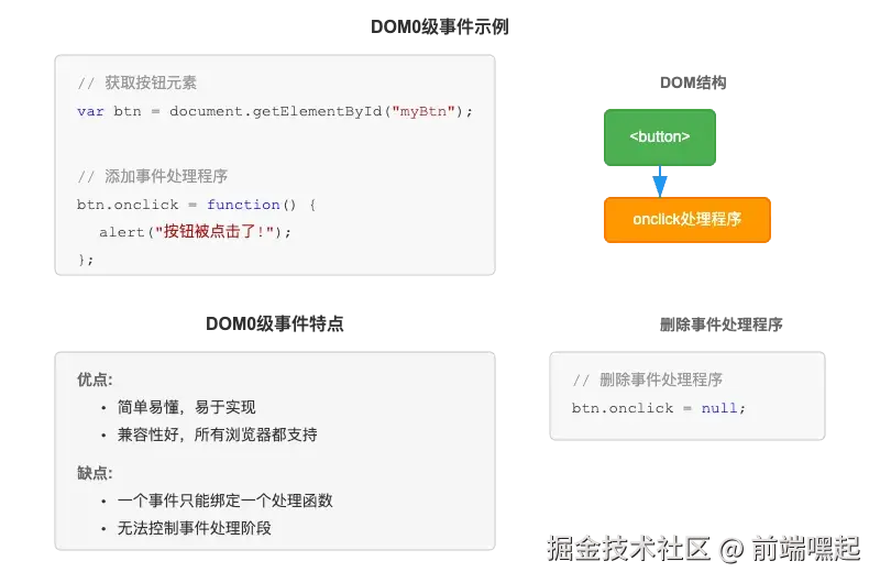 DOM0级事件处理程序是最早期的事件处理方式,它非常简单直接。通过将一个函数赋值给一个事件处理属性来实现,例如: