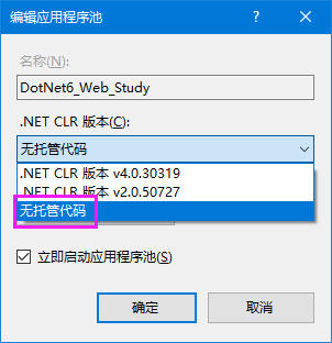 “.NET CLR 版本”下拉框中必须选择“无托管代码”。必须将【Hosting Bundle】程序安装成功后才能选择到“无托管代码”选项。